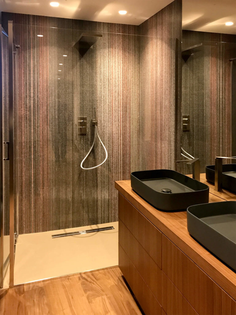 Inoltre abbiamo studiato ogni elemento dell’abitazione nel dettaglio, con soluzioni esclusive pensate in esclusiva per il cliente. Tra queste si distinguono i serramenti e le tende a scomparsa, le porte interne e i battiscopa a filomuro, le scale a sbalzo con parapetti strutturali in vetro.