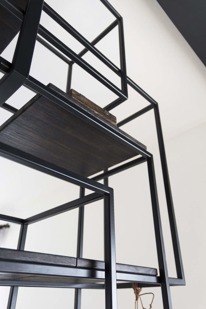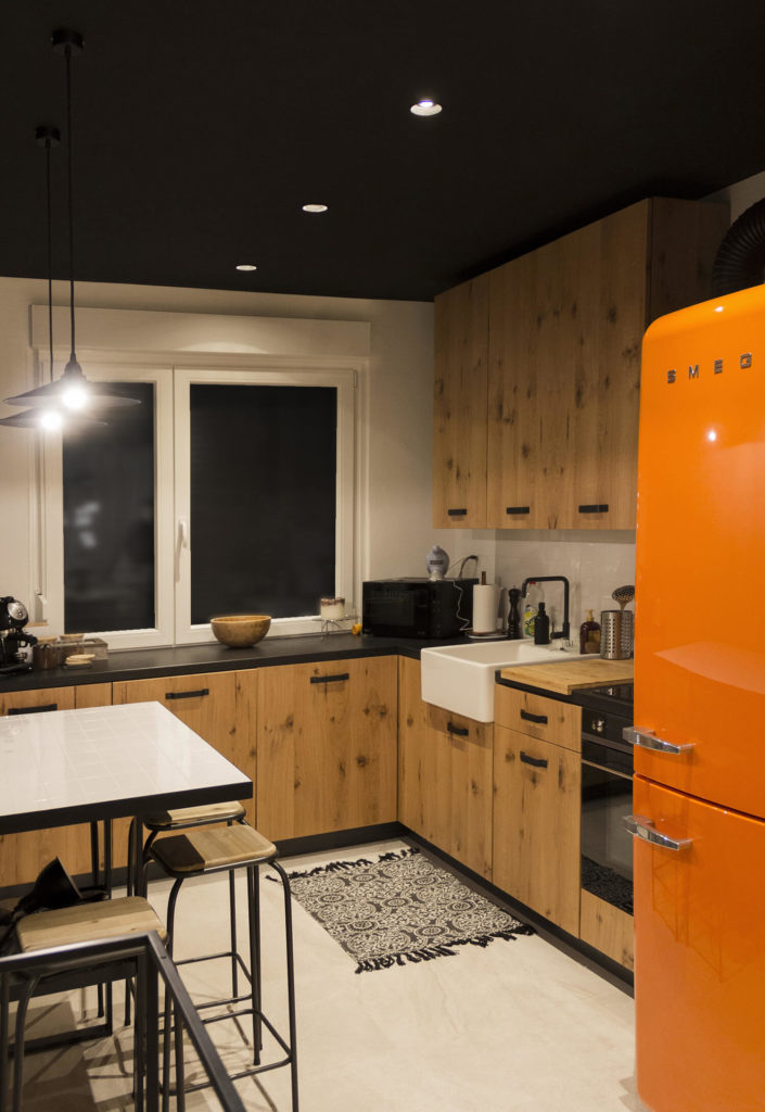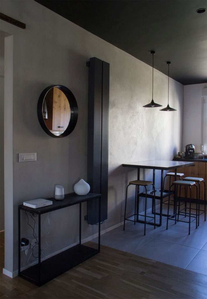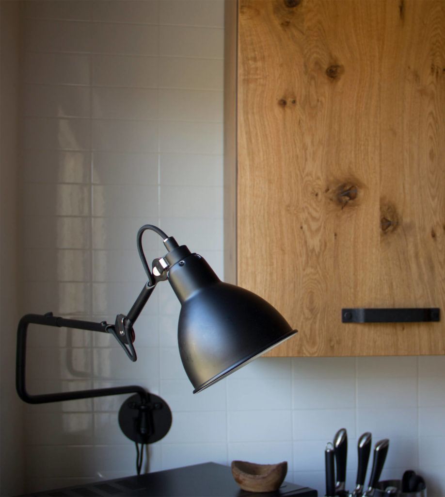Il progetto di interni in stile industriale ha previsto nella cucina una combinazione attenta di diversi materiali: legno, granito nero assoluto fiammato e spazzolato, ceramica bianca e metallo color antracite. Inoltre abbiamo esteso l’utilizzo dei materiali di finitura nell’arredo e viceversa. Il tavolo infatti si presenta con un piano in piastrelle di piccolo formato, di colore bianco. Lo stesso materiale si ritrova nel rivestimento della parete.