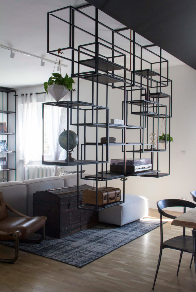 La zona living è fisicamente separata dalla sala da pranzo da una libreria metallica appesa al soffitto. Essa però, grazie alla sua leggerezza e trasparenza, non preclude ai commensali la visuale verso il soggiorno.
