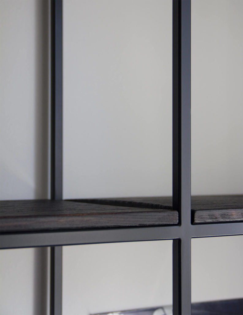 La libreria in metallo presenta delle mensole in legno microlamellare di faggio. Le mensole sono state posizionate ad incastro nelle parti orizzontali del reticolo metallico verniciato, il quale costituisce la struttura portante della libreria.